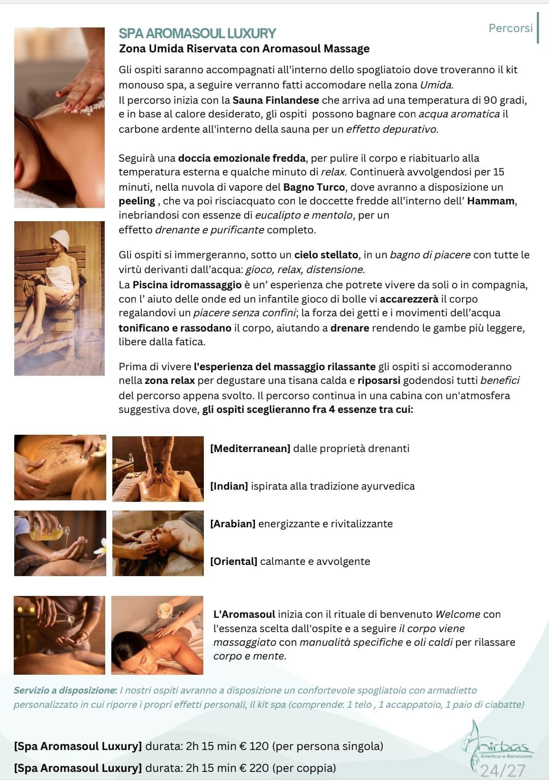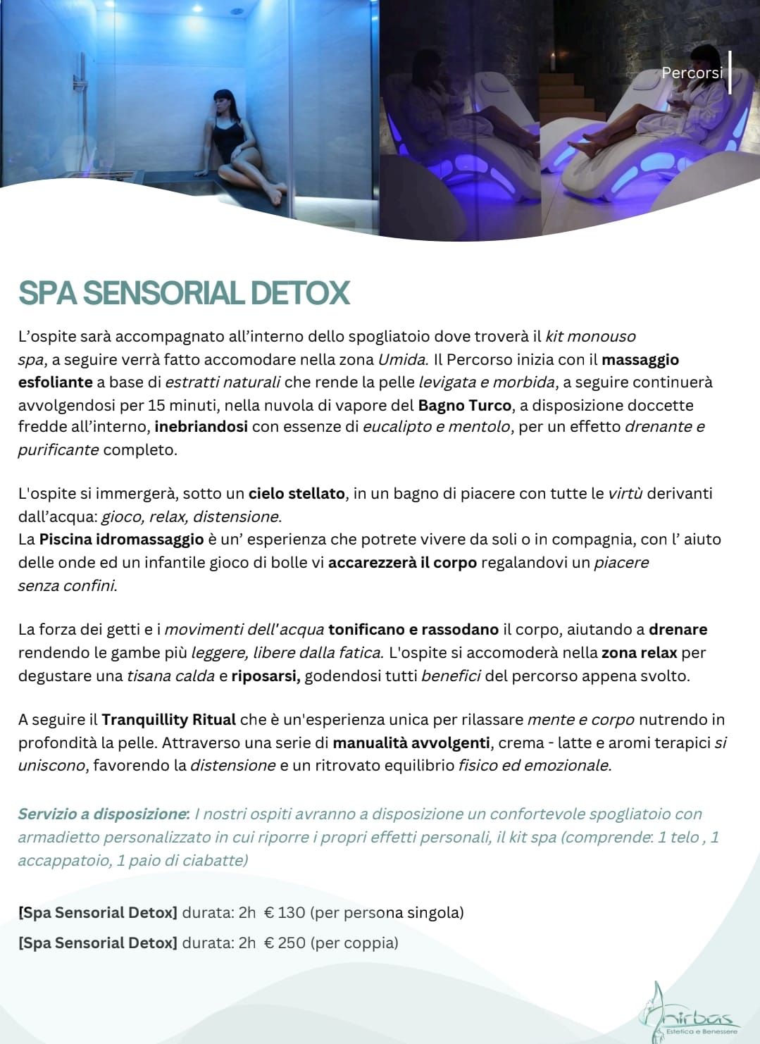 La nostra spa offre un'esperienza sensoriale unica, dove ogni dettaglio è pensato per il totale relax e rigenerazione del corpo e della mente. I nostri percorsi sono studiati per rispondere a ogni necessità, dal detox profondo alla distensione più completa. Ogni ospite sarà accolto in un ambiente esclusivo e riservato, dove i trattamenti personalizzati e la cura per ogni dettaglio contribuiranno a creare un’esperienza di puro piacere.